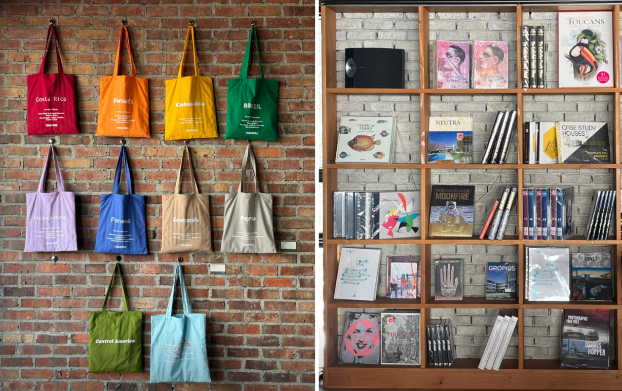 서종 테라로사는 테라로사 브랜드 특유의 빨간 벽돌 외관과 널찍한 유리창이 인상적입니다. 건물에 들어서면 입구에 굿즈와 원두 등 상품 파는 공간이 있어요.