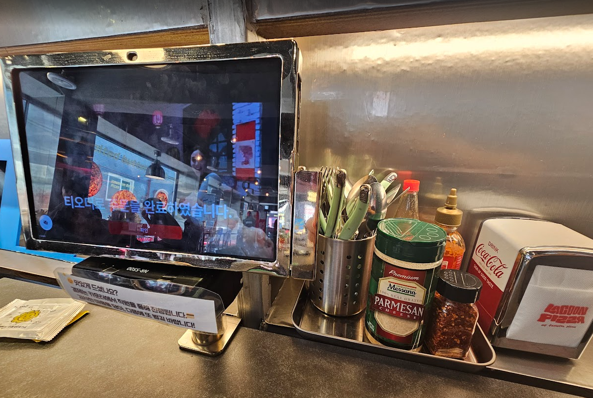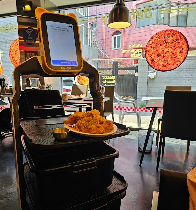 라쿤 피자는 건대 먹자골목에서는 살짝 떨어진 위치에 있지만, 오히려 그래서 그런지 조용하고 여유롭게 즐길 수 있는 분위기가 좋았습니다. 매장 내부는 굉장히 스타일리시하고 감각적인 인테리어로 꾸며져 있었고, 무엇보다 특이했던 건 음식을 로봇이 서빙해준다는 점! 피자와 맥주를 들고 귀엽게 움직이는 로봇을 보는 재미가 은근히 있었고, 이런 디테일 덕분에 더 즐겁게 식사할 수 있었던 것 같아요.