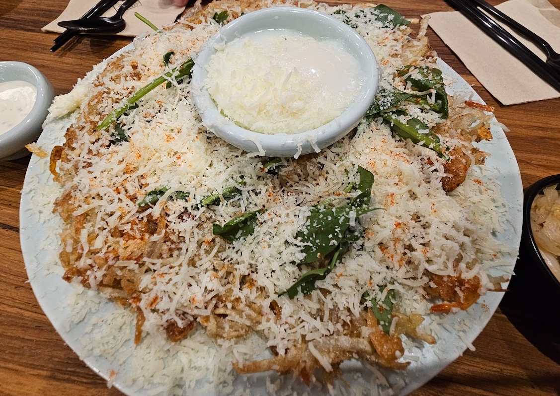 먼저 새우 감자전은 기대 이상이었습니다. 겉은 바삭하게 잘 구워졌고, 안에는 통통한 새우가 촘촘하게 박혀 있어서 씹을 때마다 새우의 식감이 살아 있더라고요. 위에 치즈 가루가 살짝 뿌려져 있어서 고소한 맛도 한층 더해졌습니다. 수란이 같이 나와서 찍어먹으라고 하더라고요.