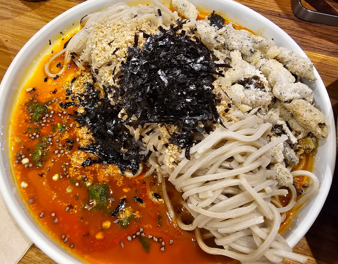 매콤 들기름 막국수는 개인적으로 가장 손이 자주 간 메뉴였어요. 그냥 들기름만 넣은 막국수가 아니라, 매콤한 소스가 은근히 중독성 있는 맛을 만들어내더라고요. 결국엔 재주문까지 했습니다. 그리고 옆에 같이 나온 김부각이 달달해서 매콤한 맛과 잘 어울렸어요.
