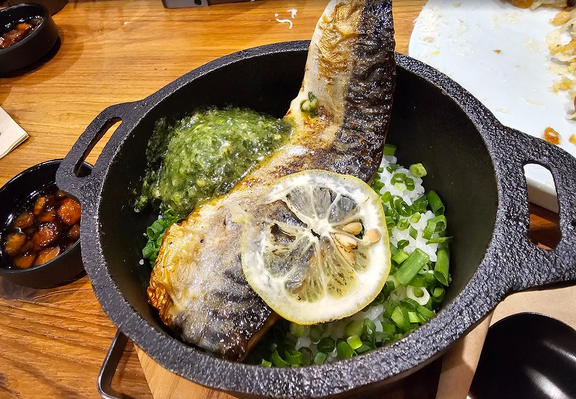 그리고 인상적이었던 메뉴 중 하나가 깻잎 고등어 지짐밥인데요, 뜨거운 솥 그릇에 고등어 한 덩이가 밥과 함께 나옵니다. 함께 나온 양파 간장을 조금씩 넣어 비벼 먹는 방식이에요. 보기엔 작아 보였는데, 실제로 먹어보니 양도 푸짐했고 고등어의 담백함에 간장의 감칠맛이 잘 어우러졌습니다.